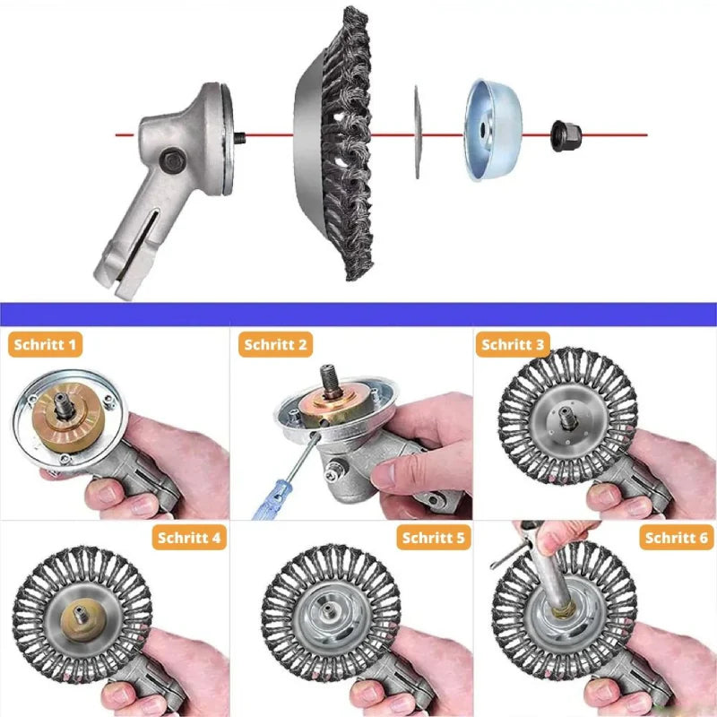 Der Rasentrimmer sollte jederzeit einsatzbereit sein. Befestigen Sie das Zubehör zunächst mit Schraube und Mutter an Ihrem Gerät.